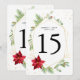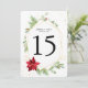Theme Parties' holiday greenery table numbers design features hand-painted watercolor botanicals and a pretty red poinsettia. The design is framed in a double gold watercolor diamond and accented with matching gold speckles. #Christmas #Holidays #HolidayParty