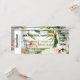 Tropical flowers and botanical green leaves are the background for this Boarding Pass Destination Tropical invitation.