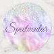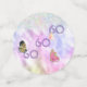 These fun confetti discs feature shimmering shades of purple, pink and yellow with pastel glitter sparkles cascading down from the top. Delicate butterflies are resting on the text. Each side has a different design.