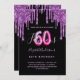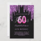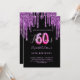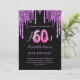 A girly and feminine 60 & Fabulous birthday party invitation. On front: A chic black background. Decorated with dark purple faux glitter drips, paint dripping look. Personalise and add a name and party details. The name is written with a hand lettered style script, light purple coloured letters. Age: 60 with a trendy balloon style font.