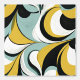 This 60s inspired swirls abstract design brings a modern twist to the dynamic hippie-era style with it's playful shapes and striking colour palette of powder blue, saffron gold, white and black. The colourful composition captures the essence of modern psychedelic patterns.