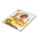 This tile features a retro image of a girl listening to records. The background colour can be customised as needed.
