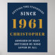 A personalised classic poster design for that birthday celebration for a special person born in 1961 and turning 60. Add the name to this vintage retro style blue and gold design for a custom 60th birthday gift. Easily edit the name and year with the template provided. A wonderful custom blue birthday gift. More gifts and party supplies for that 60th party celebration available in the store.