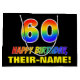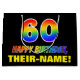 This cheerful, fun, and colourful birthday gift bag design features a large number "60" and the message "HAPPY BIRTHDAY,", both coloured with a rainbow spectrum gradient inspired pattern, along with a bold yellow customisable recipient name. The background is coloured black. A fun birthday themed gift bag like this could be used to wrap a gift or present being given to celebrate somebody’s sixtieth birthday. [~Z0000477]