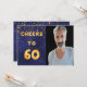 A trendy 60th birthday party invitation. With the text: Cheers to 60 on front written with faux gold balloon letters. Dark blue background, the blue colour is uneven. With golden confetti. Template for your photo.
