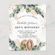 For a 60th birthday party. A white background decorated with eucalyptus greenery and golden leaves. Golden faux glitter spots. Personalize and add your names and wedding details. Black and golden colored letters. Number 60 is written with balloon style font.