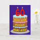 The front of this joyful and fun birthday themed greeting card design features a depiction of a three-tier birthday cake having numeral-shaped candles on top showing the number “60“, along with the message “HAPPY 60TH BIRTHDAY,”, and an editable recipient name. The inside has a customised birthday greeting message, or could perhaps be cleared and left blank if a message is to be written by hand instead. A cheerful, customised birthday greeting card like this might be sent in celebration of somebody’s sixtieth birthday. [~Z0000620]