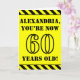 The front of this fun and attention-grabbing birthday themed greeting card design features an editable name and the message "YOU’RE NOW 60 YEARS OLD!" in black stencil look text on a yellow coloured background. The front also features an eye-catching black and yellow striped pattern at the top and bottom edges. The inside features a customisable birthday greeting message, or could perhaps be cleared and left blank if a message is to be written by hand instead. A customisable birthday card like this might be a fun way to send a message in celebration of somebody’s sixtieth birthday. [~Z0000413]