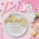 Elegant Birthday Party Paper Plates for women. 60th birthday party plates for birthdays. Beautiful white damask pattern background with a pretty, stylish romantic gold bow and ribbon image. These glamourous, chic, classy custom party paper plates are beautifully sophisticated and is are perfect for all ages. All text is fully customisable to meet your requirements. PLEASE NOTE: All cake picks on Zazzle have flat printed images. Bow and ribbon images purchased from digital-designs-by-elena. If you need any assistance customising your product please contact me through my store and I will be happy to help.