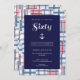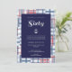 This nautical, summer, beach, "yacht club" style sixtieth birthday invitation features a red, white and blue madras pattern background with a navy blue overlay. The text "Sixty" is in a silver faux "foil" style with a matching silver anchor. The text can be customised for your special occasion leading up to the celebration of a 60th birthday.