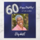 A navy blue background. The blue colour is uneven. Personalise and add a date, name and a photo. Age number written with a faux silver looking balloon style font.