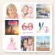 A party coaster for a girly 60th birthday party, celebrating her life with a collage of 8 of your photos. Templates for a name, age 60 and a date. Date of birth or the date of the party. Coral and burgundy coloured letters. White background.