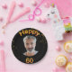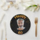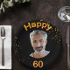 A paper plate for a 60th birthday party for guys. Template for your photo. Black background and the text: Happy 60. The text is written with a trendy faux gold balloon script. Golden confetti as decoration.
