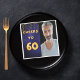 A napkin for guys 60th birthday party. Template for your photo. Dark blue background and the tex: Cheers to 60. The text is written with a trendy faux gold balloon script. The dark blue colour is uneven. With golden confetti as decor.