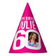 Bright add your own photo and name party hat. Ideal for a special girls 60th birthday party celebration. Vibrant hot pink and white design. Other matching birthday items are available. Original graphic art and design by www.mylittleeden.com