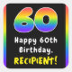This vibrant and bold birthday-themed square sticker design features a big number “60“ with a colorful rainbow spectrum inspired gradient pattern, along with the message “Happy 60th Birthday,”, and a personalized recipient name. Stickers like these might be used or given out at a party held for somebody who is celebrating their 60th birthday, or perhaps used when preparing gifts or invitations for such an event. [~Z0000630]