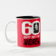 Fun 60th red, black and white personalised photo milestone birthday mug. Personalise this birthday mug with your own photograph in the middle of the number 0. Great idea for adding some fun to a milestone sixtieth birthday. Other matching items and colours are available. Exclusive design by Sarah Trett for www.mylittleeden.com