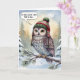 A charming owl in a winter hat perches on a snow-covered branch in a peaceful snowy forest, depicted in watercolor, for anyone's 60th birthday.