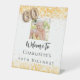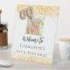 A welcome sign for a feminine and glamourous 60th birthday party. A white background decorated with colden confetti. Personalise and add a photo and name. Number 60 is written with a balloon style font.