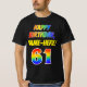 The front of this bold, colourful, and exciting birthday shirt design features a large number "61" and the message "HAPPY BIRTHDAY,", both having a rainbow spectrum gradient inspired pattern colouring, along with a bold yellow editable name. Vibrant birthday-themed shirts like this might be worn by the guests at a celebration being held in honour of somebody’s sixty first birthday. [~Z0000473]