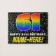This colourful and cheerful birthday jigsaw puzzle design features a large number “61” with a multicolored rainbow spectrum inspired gradient pattern, along with the message “HAPPY 61st BIRTHDAY,”, and a personalised recipient name. The background features a vibrant pattern of musical notes and symbols with various sizes and colours. An upbeat, customisable birthday puzzle like this might be a fun way to deliver birthday greetings to somebody who is celebrating their sixty-first birthday. These might be more meaningful for a music-themed birthday party. [~Z0000608]