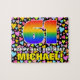 This vibrant and fun birthday themed jigsaw puzzle design features a large number “61” having a multicolored rainbow spectrum inspired gradient pattern. It also features the message “HAPPY 61st BIRTHDAY,”, and a customisable recipient name. The background features an upbeat pattern of heart shapes having various colours and sizes. An eye-catching, customised birthday puzzle like this might be a fun way to deliver birthday greetings to somebody who is celebrating their sixty-first birthday. [~Z0000611]