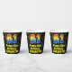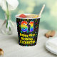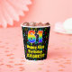 This cheerful and exciting music themed birthday paper cup design features a large number “61” with a rainbow spectrum gradient inspired pattern, along with the message “Happy 61st Birthday,”, and a personalised name. The background features a colourful pattern of various music notes and symbols having a variety of sizes and colours. Vibrant, colourful paper cups like this might be fun to have at a birthday party being held to honour somebody’s sixty first birthday. [~Z0000541]