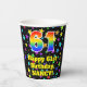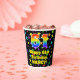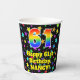 This colourful and cheerful birthday-themed paper cup design features a large number “61” with a rainbow spectrum gradient inspired pattern, along with the message “Happy 61st Birthday,”, and an editable name. The background features a multicolored pattern featuring many star shapes with different colours and sizes. Colourful, vibrant paper cups like this might be fun to have at a birthday celebration/party being held to celebrate somebody’s 61st birthday. [~Z0000540]