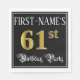 This ornate and elegant birthday themed paper napkin design features a customizable name and the message “61st Birthday Party”. The large number “61st” has an imitation/faux gold-inspired coloring pattern, the words “Birthday Party” are in opulent script-style text, and the background is colored black by default (although it can be customized). Luxurious, opulent paper napkins like this might be useful at a birthday celebration/party being held in celebration of somebody’s 61st birthday. [~Z0000565]