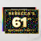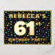 The front of this upbeat sixty-first birthday party/celebration foil invitation card design features a personalised name, a large number “61st”, the message “BIRTHDAY PARTY!”, and a border. The background of the front has a joyful, multicolored star shapes pattern. The back features personalised details about the event, such as the date, time, location/venue, and any other important information. Editable invitations like these might be a fun way to invite guests/attendees to a birthday gathering being held in celebration of somebody’s 61st birthday. [~Z0000600]