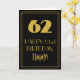The front of this vintage look birthday-themed greeting card design features a large art deco look inspired number "62", the message "HAPPY 62nd BIRTHDAY,", a personalised name, and a border pattern consisting of lines. There is a black-coloured background on the front. The inside features an editable birthday greeting message, or could perhaps be cleared and left blank if a message is to be written by hand instead. A personalised birthday card like this might be a fun way to send a message in celebration of somebody’s sixty second birthday. [~Z0000502]