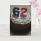Still Life photography, of a birthday cake for the one turning 62, and a birthday greeting comprise this card.