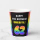 This joyful and cheerful birthday themed paper cup design features the number “62“ with a vibrant multicolored rainbow spectrum inspired gradient pattern, along with the message “HAPPY 62nd BIRTHDAY,”, and a personalised recipient name. Paper cups like this might be used when celebrating somebody’s sixty second birthday. [~Z0000639]