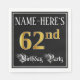 This luxurious and ornate birthday-themed paper napkin design features an editable name and the message “62nd Birthday Party”. The large number “62nd” has a faux/imitation gold-inspired coloring pattern, and the words “Birthday Party” are in opulent script-style text. The background is colored black by default (although it can be customized). Fancy, opulent paper napkins like this might be useful at a birthday party/celebration being held to celebrate somebody’s sixty second birthday. [~Z0000565]