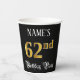 This fancy and luxurious birthday-themed paper cup design features a custom name and the message “62nd Birthday Party”. The large number “62nd” has an imitation/faux gold-inspired colouring pattern, the words “Birthday Party” are in ornate script-style text, and the background is coloured black by default (although it can be customised). Ornate, elegant paper cups like this might be used at a birthday celebration/party being held to honour somebody’s sixty second birthday. [~Z0000567]