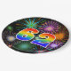 This fun, colourful, and cheerful paper plate design features a large number "62" containing a rainbow spectrum gradient inspired pattern. It also features a vibrant and exciting bursting celebratory fireworks inspired pattern. It has a black coloured background. Fun paper plates like this might be used at somebody’s sixty second birthday party, a sixty second anniversary celebration, or some other sixty second event. [~Z0000490]