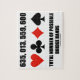 Showcase your wry bridge / duplicate bridge side with this jigsaw puzzle featuring the four card suits along with the following saying: "635, 013, 559, 600 Total Number Of Possible Bridge Hands". Make others do a double-take at the number of possible combinations amongst 13 cards there truly are once a hand has been dealt! A bridge player will definitely not live to play them all!