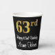 This luxurious, elegant, and stylish birthday-themed paper cup design features a large ordinal number “63rd” having a faux/imitation gold-inspired appearance, plus the birthday greeting message “Happy 63rd Birthday,” and a custom name in a script-style font. It also has a black-coloured background. Paper cups like this might be used when celebrating somebody’s sixty third birthday. [~Z0000538]