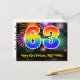 The front of this colourful, fun, and exciting birthday themed postcard design features a large number "63" with a rainbow spectrum gradient inspired pattern, along with the message "Happy 63rd Birthday,", and a custom recipient name. The front additionally has a vibrant and colourful background pattern inspired by the appearance of bursting celebratory fireworks. The back features a personalised birthday greeting message, or could perhaps be cleared and left blank if a message is to be written by hand instead. A birthday postcard like this might be a fun way to send birthday wishes to somebody who is celebrating their sixty third birthday. Postcards like this might also be used to invite guests to a birthday celebration being held for somebody who is turning 63 years old. [~Z0000446]
