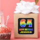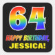 This colourful, fun, and cheerful birthday sticker design features a large number "64" and the message "HAPPY BIRTHDAY,", both coloured with a rainbow spectrum gradient inspired pattern, along with a bold yellow editable name. The background is coloured black. Fun stickers like this could be used when wrapping a birthday present or gift being given to somebody who is celebrating their 64th birthday, or perhaps may be given out to the guests at a birthday party or celebration. [~Z0000480]