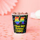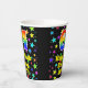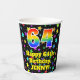This colourful and joyful birthday themed paper cup design features a large number “64” with a rainbow spectrum gradient inspired pattern, along with the message “Happy 64th Birthday,”, and a custom name. The background features a multicolored pattern having many star shapes with different sizes and colours. Vibrant, colourful paper cups like this might be fun to have at a birthday celebration being held to celebrate somebody’s sixty fourth birthday. [~Z0000540]