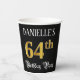This luxurious and ornate birthday themed paper cup design features a personalised name and the message “64th Birthday Party”. The large number “64th” has a faux/imitation gold-inspired colouring pattern, and the words “Birthday Party” are in fancy script-style text. The background is coloured black by default (although it can be customised). Fancy, elegant paper cups like this might be useful at a birthday party/celebration being held in celebration of somebody’s 64th birthday. [~Z0000567]