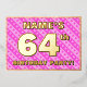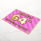 The front of this joyful sixty-fourth birthday celebration/party foil invitation card design features a customisable name, a large number “64th”, the message “BIRTHDAY PARTY!”, and a border. The background of the front has a fun pattern with dark pink and light pink stripes and heart shapes. The back features personalised details about the event, such as the date, time, venue, and any other important information. Customised invitations like these might be a fun way to invite attendees/guests to a birthday gathering being held to honour somebody’s 64th birthday. [~Z0000603]