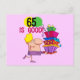 65th Birthday T-shirts, mugs, cards, stickers, tote bags, 65th birthday buttons, magnets, and other 65th birthday apparel and gifts with a cute cartoon lady carrying a stack of birthday gifts and text that reads "65 is Good!".