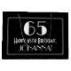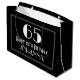 This 1920s-1930s style inspired vintage look birthday-themed gift bag design features a large art deco look inspired number "65", the message "Happy 65th Birthday,", a custom name, and a border pattern consisting of thin lines. The background is coloured black. A gift bag like this might be used when wrapping gifts being given to somebody in celebration of their sixty fifth birthday. [~Z0000496]