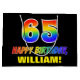 This fun, colourful, and cheerful birthday gift bag design features a large number "65" and the message "HAPPY BIRTHDAY,", both having a rainbow spectrum gradient inspired pattern colouring, along with a bold yellow editable recipient name. The background is coloured black. A fun gift bag like this might be used when wrapping gifts being given to somebody in celebration of their 65th birthday. [~Z0000477]