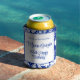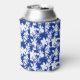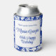 Elegant, chic design featuring a beautiful and modern white floral pattern on azure blue. Delicate blue frame and elegant fonts for birthday party details and customisation for can cooler, created as a fun and useful party supply and favour gift for your guests.