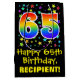 This vibrant, colourful, and exciting birthday-themed gift bag design features a large number "65" with a rainbow spectrum gradient style pattern, along with the message "Happy 65th Birthday,", and a customisable recipient name. It also has a background pattern featuring star shapes of various sizes and colours. A gift bag like this might be used when wrapping gifts being given to somebody in celebration of their sixty fifth birthday. [~Z0000510]