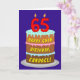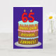 This upbeat and cheerful birthday-themed greeting card design features a depiction of a three-tier birthday cake having numeral-shaped candles on top showing the number “65“, along with the message “HAPPY 65TH BIRTHDAY,”, and a customisable recipient name. The inside features a personalised birthday greeting message, or could perhaps be cleared and left blank if a message is to be written by hand instead. A joyful, customised birthday greeting card like this might be a fun way to deliver some birthday wishes to somebody who is celebrating their sixty-fifth birthday. [~Z0000620]