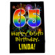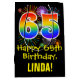 This exciting, colourful, and fun birthday themed giftbag design features a large number "65" with a rainbow spectrum gradient inspired pattern, along with the message "Happy 65th Birthday,", and a customisable recipient name. It also features a colourful background pattern inspired by the look of bursting celebratory fireworks. A fun gift bag like this might be used when wrapping presents being given to somebody in celebration of their sixty fifth birthday. [~Z0000509]